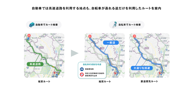 高速道路や自動車専用道路など自転車の交通規制を考慮し、自転車が通れる道だけを使った自転車専用ルートを検索できます。また、小回りが利く車両特性や安全面から、大通りを避けた「裏道優先」ルートも提案します。