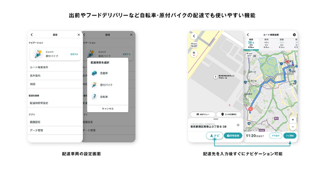 出前やフードデリバリーなど、自転車やバイクによる宅配需要が増加していることから本機能に対応しました。また、自転車やバイクの高速道路への誤進入も社会課題となっており、誤進入の車両種別内訳では、原付バイクが57%、自転車が13%となっているデータ※2もあります。自転車・原付バイク設定時には、高速道路は通らないなど車両に合わせた専用のルート検索とナビゲーション機能で安心・安全な配達をサポートし、事故削減に寄与したいと思っております。