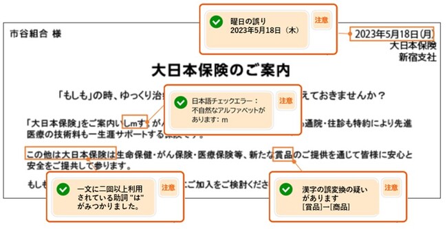 大日本印刷株式会社(DNP)は、AIを活用して製品のパッケージや広告物、契約書等の校正・校閲・審査業務の省力化を支援する「DNP AI審査サービス(校正・回覧業務)」*1に、「日本語の誤用などのチェック」「表組みの校正・校閲チェック」「多言語対応」の新機能を追加し、2023年6月23日に提供を開始します。新機能の実装により、サービス提供する業界を拡大し、校正・校閲・審査業務のDX(デジタルトランスフォーメーション)を推進します。