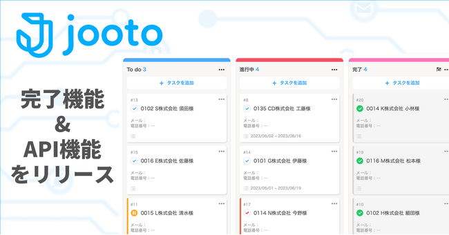 株式会社PR TIMES(東京都港区、代表取締役:山口拓己、東証プライム:3922)が運営するタスク・プロジェクト管理ツール「Jooto(ジョートー)」は、未完了や期限超過のタスクが一目で分かる「完了機能」と、外部サービスとの連携が可能になる「JootoAPI」を2023年6月22日(木)に実装いたしました。これにより進捗状況がさらに把握しやすく、またタスクに紐づく業務の自動化にお役立ていただけるようになります。同時にJooto APIの活用を支援する「API連携支援サービス」を提供開始いたしました。