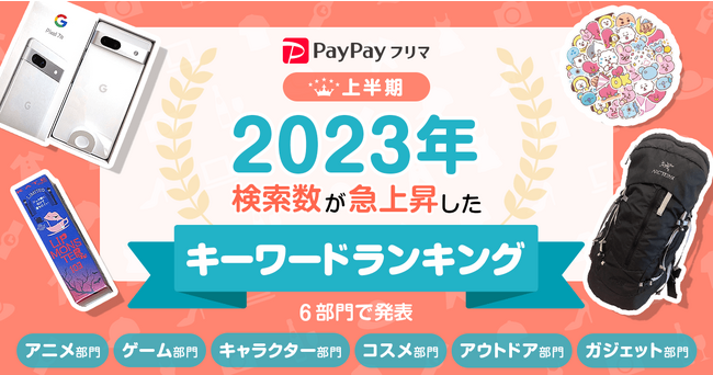 2023年1月1日(日)から6月10日(土)までの「PayPayフリマ」での検索データを集計し、10代から40代のユーザーの購入が多いホビー系カテゴリ(※1)に関連する「アニメ」「ゲーム」「キャラクター」の3部門と、「コスメ」「アウトドア」「ガジェット」の3部門を合わせた計6部門のランキングを各5位まで発表しました。