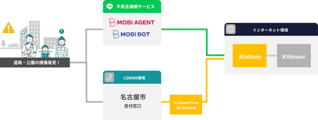 不具合を発見した住民は、これまでの電話による通報のほか名古屋市LINE公式アカウントでも通報できるようになりました。LINEで受け付けた不具合情報はインターネット内のクラウドサービス「Kintone」に連携されます。また、これまで電話で受け付けた不具合情報はLGWAN環境内のみで管理されていましたが、R-Cloud Proxy for Kintone(LGWAN-ASP)を通してKintoneに書き込み可能となり、LINEからの通報情報と合わせて一元管理できるようになりました。