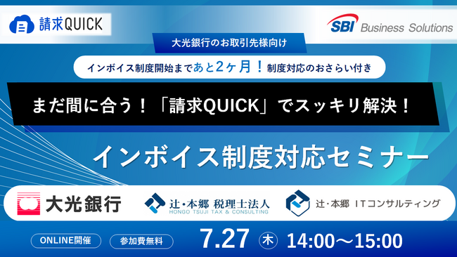 総合フィンテックソリューション企業であるSBI FinTech Solutions株式会社の子会社で、バックオフィス支援サービスを提供するSBIビジネス・ソリューションズ株式会社(本社:東京都港区、代表取締役社長:夏川 雅貴、以下「当社」)は、辻・本郷 税理士法人(本社:東京都新宿区、理事長:徳田 孝司)および、辻・本郷 ITコンサルティング株式会社(本社:東京都新宿区、代表取締役:黒仁田 健、以下「辻・本郷 ITC」)とともに、株式会社大光銀行(本店:新潟県長岡市、取締役頭取:石田 幸雄、以下「大光銀行」)のお取引事業者様及び新規見込み事業者様向けに7月27日(木)に開催される「インボイス制度対応セミナー」に登壇しますので、お知らせいたします。
