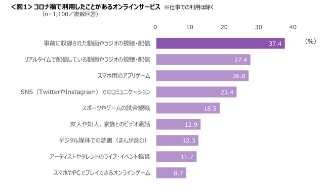 コロナ禍で利用したことがあるオンラインサービスでは、「事前に収録された動画やラジオの視聴・配信」が37.4%でトップ。以下、「リアルタイムで配信している動画やラジオの視聴・配信」(27.4%)、「スマホ用のアプリゲーム」(26.8%)と続く。<図1>