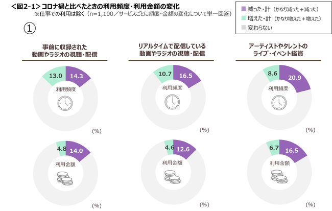 アーティストやタレントのライブ・イベント鑑賞について、約2割の人が、コロナ禍と比べて利用頻度が減ったと回答。今回聴取したすべての項目で、コロナ禍と比べて利用金額は減少。<図2>