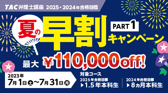 資格取得に向けた教育サービスを展開しているTAC株式会社(東京都千代田区、代表取締役社長:多田 敏男)では、ただいま夏の早割キャンペーンを実施中です。これから弁理士を目指す方は、7/31(月)までのお申込みが、一番お得です。この機会をお見逃しなく。