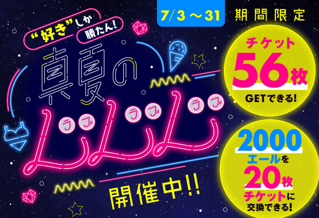 7月3日~31日で開催の第2弾「"好き"しか勝たん!真夏のLLL(ラブ・ラブ・ラブ)」は第1弾同様にボーナスチケットもドドンと大放出!