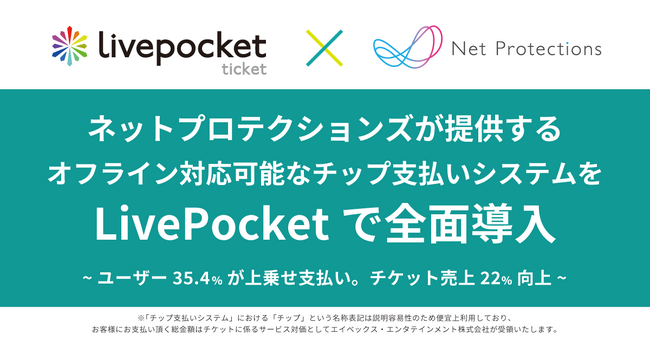 株式会社ネットプロテクションズ(所在地:東京都千代田区、代表取締役社長:柴田 紳、以下当社)は、エイベックス・エンタテインメント株式会社(所在地:東京都港区、代表取締役社長:黒岩 克巳、以下エイベックス・エンタテインメント)が運営するチケット販売プラットフォーム「LivePocket -Ticket-」( (リンク ») ) において、オフライン含め対応可能なチップ支払いシステム(※1)を全面導入頂きました。