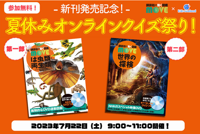 累計555万部突破の、子どもに大人気の図鑑「講談社の動く図鑑MOVE」シリーズ。この夏、『世界の探検』と『は虫類・両生類 新訂版』が新たに登場! 2書目の発売を記念して、7月22日(土)に参加無料のオンラインイベント「夏休みオンラインクイズ祭り」を開催します。