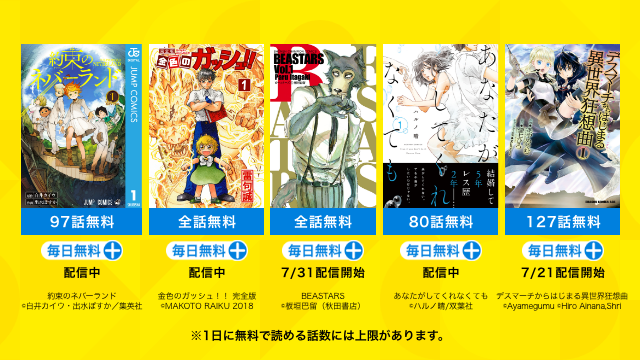 「毎日無料+」では、7月は『約束のネバーランド』『あなたがしてくれなくても』など全16作品を配信予定、今後も人気のラインナップを取り揃えてまいります。ぜひご期待ください。