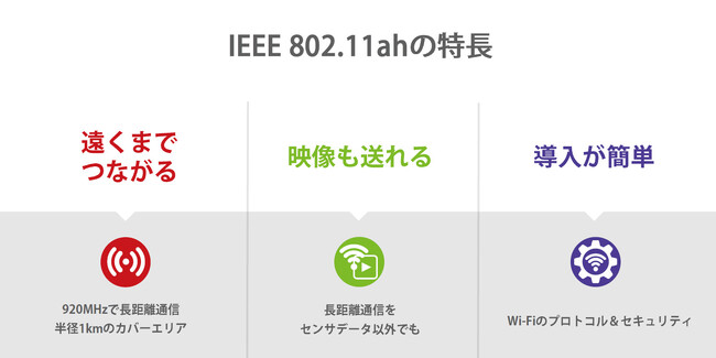 IEEE 802.11ahは電気・電子分野で世界最大の専門化組織であるIEEE(アイトリプルイー)によって標準化されている規格です。IEEE 802.11ahの日本での利用開始に伴い、かねてから需要のあったIoT遠隔監視用としての静止画/動画の伝送用途において、コストや性能面で要望に応える製品として開発されました。