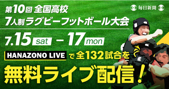 毎日新聞社は、7月15日(土)に長野・菅平高原で開幕する第10回全国高等学校7人制ラグビーフットボール大会(日本ラグビーフットボール協会主催、毎日新聞社など後援)の全132試合を高校ラグビー公式サイト「HANAZONO LIVE」( (リンク ») )で無料ライブ配信します。試合終了後は、見逃し配信も展開。9月のラグビーワールドカップフランス大会に注目が集まる2023年の夏を駆け抜ける高校生たちの激闘をお楽しみいただけます。