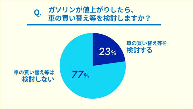 ガソリンが値上がりしても 車の買い替え等を検討しない方は 77% と、多数を占めました。