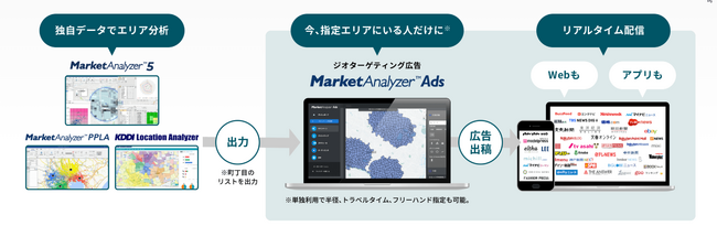 本サービスは、「MarketAnalyzer(TM) 5」と連携し、GISで導いた精緻な商圏分析結果をそのまま町丁目単位で広告配信に活用でき、効果測定までスムーズに実現するジオターゲティング広告配信プラットフォームを提供するものです。