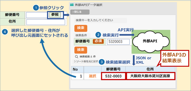 動作例:郵便番号の参照ボタンからポップアップウインドウを開き、外部APIの結果を選択