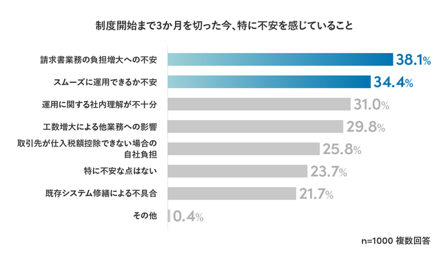 制度開始が迫る中、特に不安を感じていることの第一位は「請求書業務の負荷が増えること」(38.1%)、次いで「取引先とのやり取りや請求書形式の変更により円滑に運用できるかどうか」(34.4%)という結果でした。