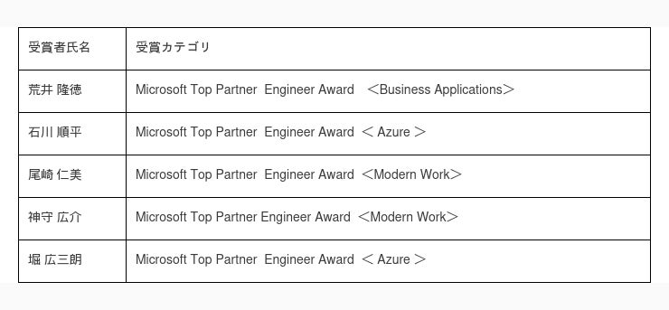 「Microsoft Top Partner Engineer Award」は今年新設されたパートナー企業の中で活躍するエンジニアを表彰するものです。Azure、Modern Work、Business Applications、Securityのカテゴリにおける案件の実績やその先進性、マイクロソフトテクノロジーの普及活動状況などが審査対象項目となります。