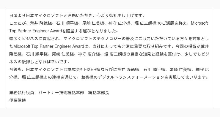 また、日本マイクロソフト株式会社様から、今回の受賞に際して以下のエンドースメントを頂戴しています。