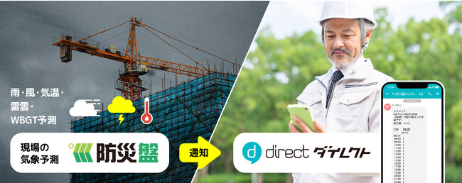「防災盤」は気象予測を500mメッシュで解析を行うことで、一般的な天気予報(おおよそ20kmメッシュ)に比べよりピンポイントでの予測を最大10日先まで提供しており、多くの建設現場で活用されています。一方、現場向けビジネスチャット「direct」は、誰もが使いこなせる簡単な操作性で現場のコミュニケーションを円滑化し、情報共有のスピード化を実現するツールとして建設業界で高い支持を得ています。