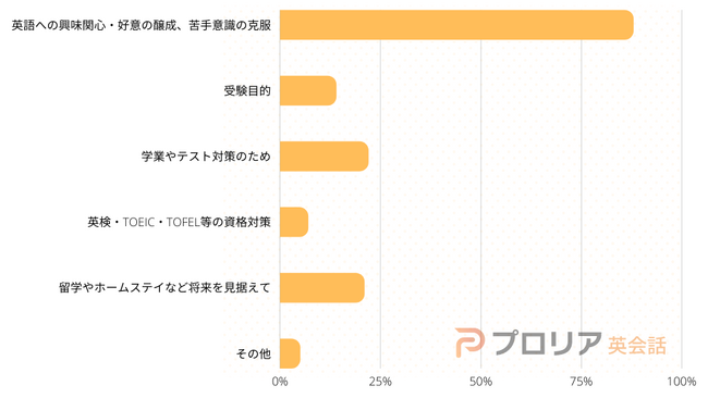 半数以上の回答者が「英語への興味関心・好意の醸成、苦手意識の克服」を目的に子ども向け英会話教室の利用を始めたと回答しています。まずは子どもに英語学習に対する興味を持ってもらい、苦手意識を克服することから始めているようです。