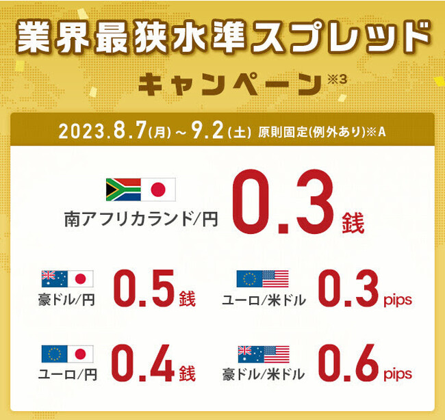 ※3 「業界最狭水準スプレッドキャンペーン」スプレッド(対象期間:2023年8月7日(月)午前9時00分~同9月2日(土)午前3時00分、提示時間帯:対象期間中の各営業日午前9時~翌午前3時)