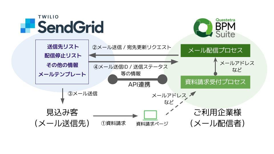 新バージョン15.1では、「Twilio SendGrid」を自動処理できるビルトインアイテムが追加されます。そのため、ナーチャリングやニュースレターなどの本格的なメールマーケティングプロセスを作成できるようになります。また、ワークフローと「Twilio SendGrid」がAPI連携することで、ワークフローデータのメールへの自動差し込みも可能となり、配信用データの誤入力を防止できるようになります