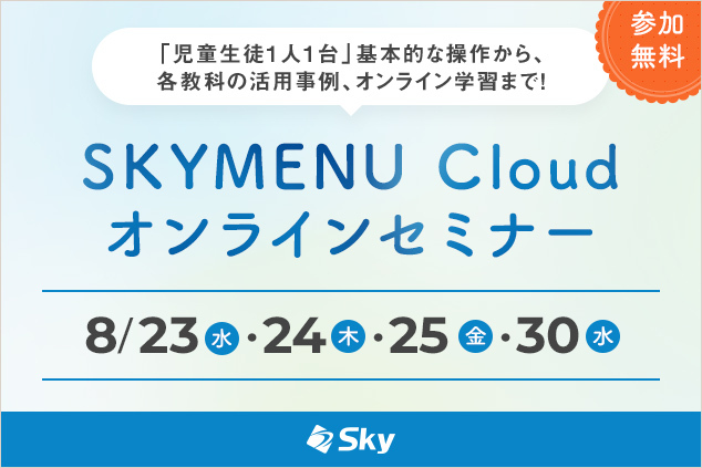 実際の授業を想定した活用シーンに合わせて「SKYMENU Cloud」の操作をご体験いただけるセミナーです。操作方法や活用場面などに関するご質問も承りますので、ぜひお気軽に「SKYMENU Cloud」をご体験ください。