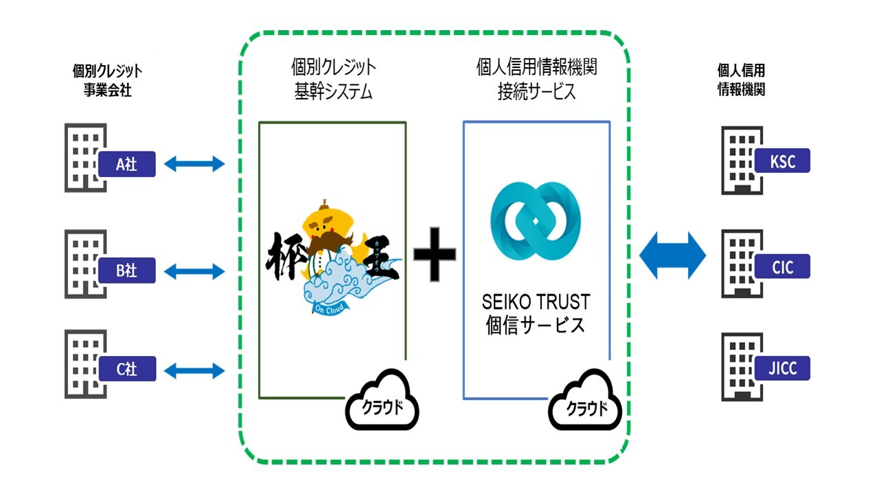 このような背景から、セイコーソリューションズの「個人信用情報機関接続サービス『SEIKO TRUST 個信サービス』」(以下、「個信サービス」)とソルクシーズの「個別クレジット基幹システムクラウドサービス『杯王 on Cloud』」(以下、「杯王 on Cloud」)を組み合わせたサービスを開始することとしました。これにより、個別クレジットにおける審査業務を確実、スピーディに実現し、個別クレジットへの新規参入や既存システムの軽量化・柔軟性の向上を検討している事業者の利便性を向上します。