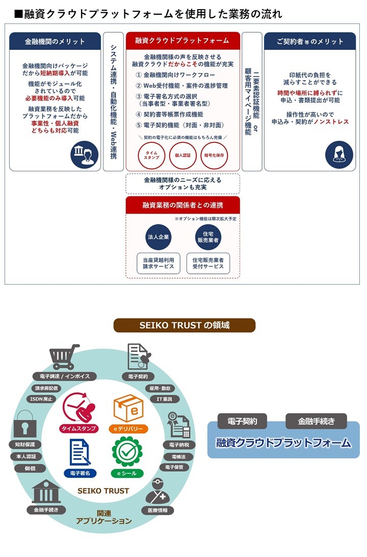 セイコーソリューションズは、「融資クラウドプラットフォーム」を含めた電子契約をはじめ、流通する電子データの信頼性を保証するサービス全般を「SEIKO TRUST」として展開しています。今後も、脱ハンコ、テレワークといった社会情勢の変化やお客さまのニーズにあわせ、サービスの拡充を図り、企業の継続的な成長を積極的に支援していきます。