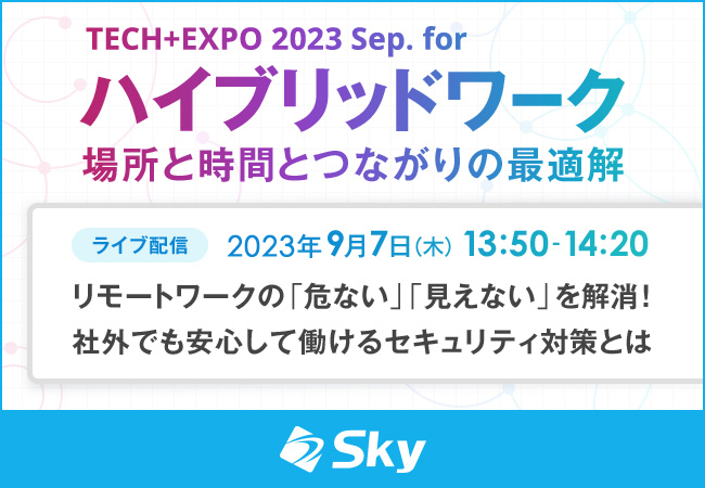 「TECH+EXPO 2023 Sep. for ハイブリッドワーク 場所と時間とつながりの最適解」に協賛、「社外でも安心して働けるセキュリティ対策」についてセミナーを実施します