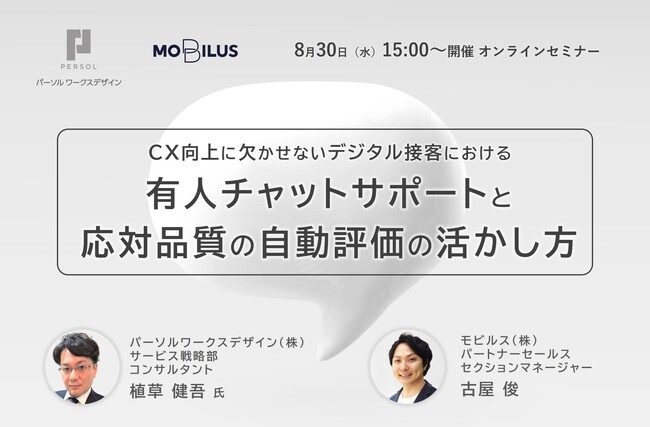 そこで今回のセミナーでは、有人チャットサポートシステム「MOBI AGENT」を提供するモビルスと、HDI 三つ星サポートのポイントを参考にした評価指標で自動評価する「AQchat」を提供するパーソルワークスデザイン株式会社と共催で、有人チャットの活用ポイントと、応対品質管理の自動化について解説していきます。