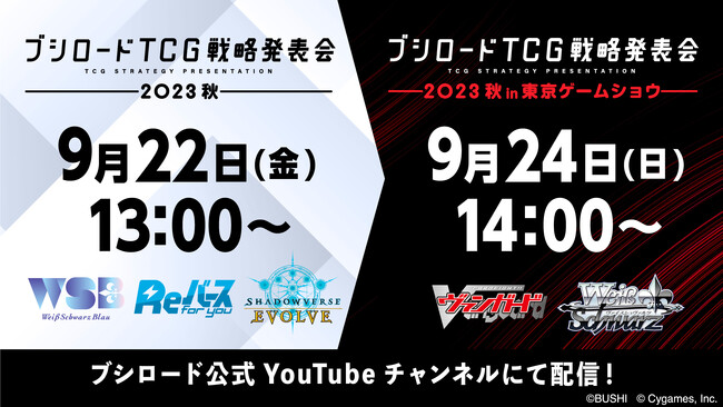 2023年9月22日(金)13:00~「ブシロードTCG戦略発表会2023 秋」、2023年9月24日(日)14:00~「ブシロードTCG戦略発表会2023 秋 in 東京ゲームショウ」を開催いたします。
