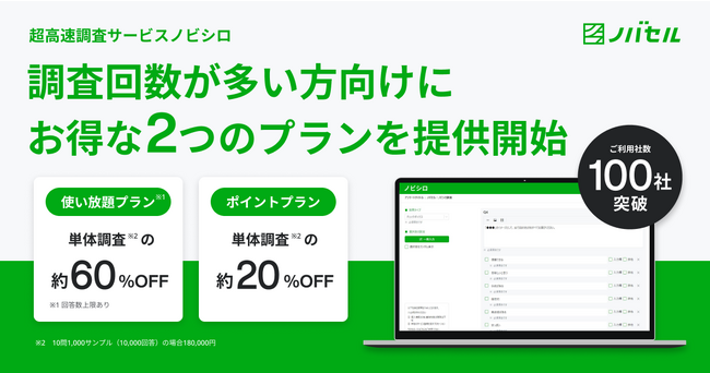 運用型テレビCMサービスを中心にマーケティングの民主化を目指すノバセル株式会社(本社:東京都品川区、代表取締役社長:田部正樹、以下ノバセル)は、高速調査サービス「ノビシロ」の新プランとして、「使い放題(回答数上限あり)プラン」とポイント購入で調査が可能な「ポイントプラン」を提供開始いたしました。