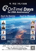 2日間をまとめて「OnTime Days for 25th Anniversary」と総称します。2日とも対面式のイベントとして準備を進めており、オンライン中継などは予定しておりません。また、2つの製品ラインにあわせ、1日目を「OnTime Day1 for Domino」、2日目を「OnTime Day2 for Microsoft」とし、それぞれのお客様やご採用を検討いただいている皆様に有益な情報をご提供します。