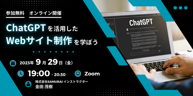 株式会社SAMURAI(本社所在地:東京都千代田区、代表取締役 :高比良 直人、以下:当社)は、無料オンラインイベント「ChatGPTを活用したWebサイト制作を学ぼう」を9月29日(金)に開催します。侍エンジニアの受講生でない方も参加可能ですので、ぜひ奮ってご参加ください。