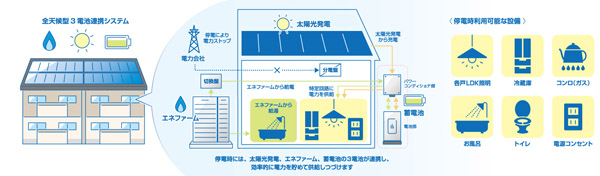 本実証実験で採用する「全天候型3電池連携システム」は、太陽光発電システムとエネファーム、家庭用リチウムイオン蓄電池を大和ハウス工業が開発した「切換盤」で連携させることで、停電時の電力と給湯を確保するとともに、通常時の光熱費を削減するシステムです。「切換盤」を設置することで、エネファームで発電した電力を家庭用リチウムイオン蓄電池に蓄え、家庭内で使用することもできます。