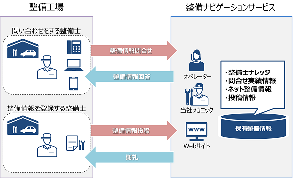 整備ナビゲーションサービスは、自動車整備工場、自動車リース事業者などを対象に修理・整備に関する情報を提供することで、情報検索に要する時間を削減します。資格を保有する整備士が、国内外のメーカーを問わず修理・整備に関する問い合わせに電話、メール、Webフォーム、FAXで対応します。
