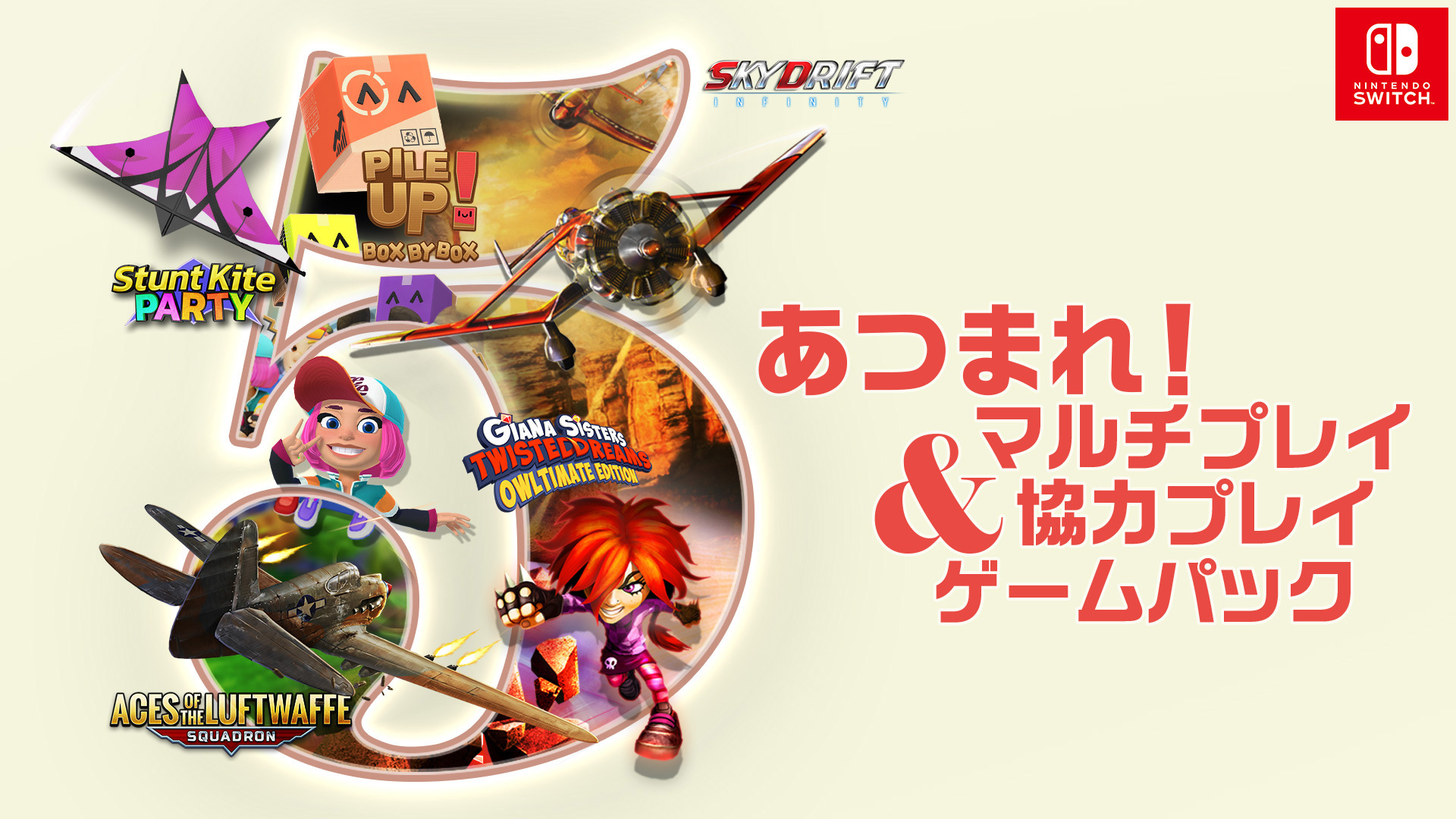 かわいい段ボールつみあげパズル『パイルアップ!ボックス・バイ・ボックス』、ライバルたちとアツい凧揚げバトル『スタント カイト パーティ』、キュートでパンクな伝説の横スクロールアクション!『ギアナシスターズ: ツイストドリームズ - オウルティメイト エディション』、空を最速で駆け抜ける戦闘機レースアクションゲーム『スカイドリフト インフィニティ』、戦闘機乗りの心をくすぐる『エース・オブ・ルフトバッフェ -スクアドロン-』が収録されています。