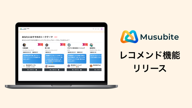 当社は、「Musubite」に登録した企業に所属しているエンジニア(以下、企業エンジニア)が公開したカジュアルトークの募集記事(以下、トークテーマ)を、Musubiteの利用ユーザー(以下、応募者)にレコメンドする機能(以下、本機能)の提供を開始しました。これにより、応募者は自分に合った企業や、興味のある企業エンジニアを一覧から探すことなく見つけることが可能になりました。