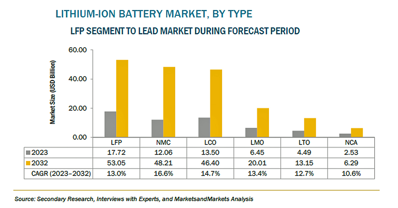 LFP(リン酸鉄リチウム)電池は高出力の機器や装置に使用されています。LFP電池のナノスケールのリン酸塩正極材料は、優れた電気化学性能と低抵抗を提供します。LFP電池はライフサイクルが長く、定格電流が大きく、熱安定性に優れ、耐性が高いため安全性が向上します。高い充放電レートは性能と能力を向上させるため、LFP電池はハイブリッド電気自動車や電動工具などの高出力用途に適しています。