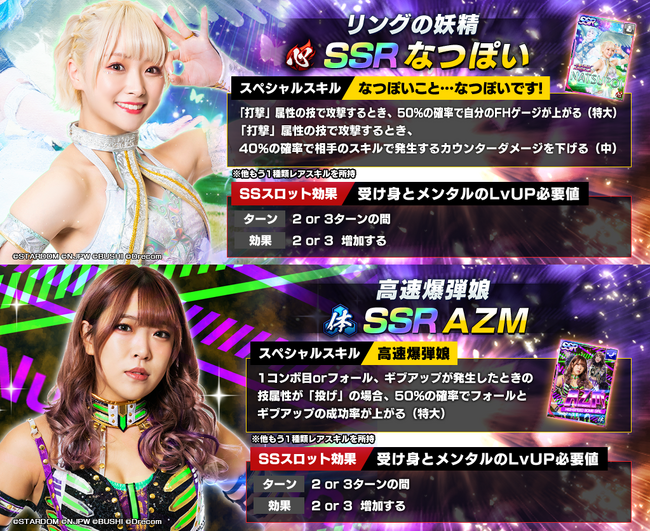株式会社ブシロード(本社:東京都中野区、代表取締役社長:木谷高明)は、株式会社ドリコム(本社:東京都品川区、代表取締役社長:内藤 裕紀)と共同開発しているスマートフォンゲームアプリ『新日本プロレスSTRONG SPIRITS』(以下、新日SS)にて、2023年9月27日(水)メンテナンス終了後より、SSRパートナーとしてSSR「[リングの妖精]なつぽい」とSSR「[高速爆弾娘]AZM」がSTARDOM限定の各スカウトにて復刻で登場しました。