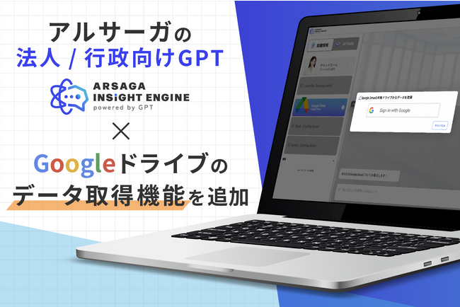 企業のDXを促進するアルサーガパートナーズ株式会社(本社:東京都渋谷区、代表取締役 /CEO・CTO:小俣泰明、以下「アルサーガパートナーズ」)は、2023年9月28日より法人/行政向けGPTサービス『ARSAGA INSIGHT ENGINE powered by GPT』にGoogleドライブのデータ取得機能を先行リリースすることをお知らせいたします。これにより、Googleドライブから取得したデータに対して直接質問を投げかけることができ、迅速かつ正確な回答を提供します。