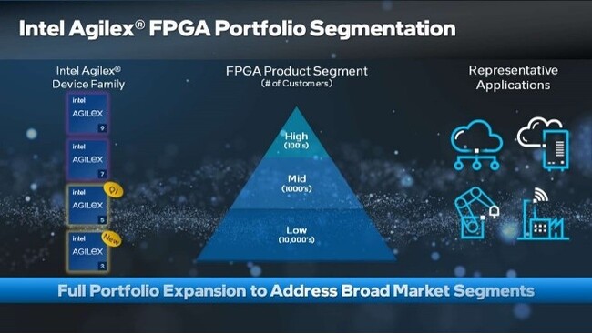 Intel Agilex(R) 3FPGA シリーズ:Intel Agilex(R) 3 デバイスは、消費電力とコストに最適化された、小型フォームファクターのFPGAです。必要不可欠なビルディング・ブロックであり、さまざまな市場を横断し、システム/ボードの監視と管理、動画とビジョン、プロトコル拡張、ポータブル画像処理とディスプレイ、センサー・フュージョン、ドライブ機器、ロボットのI/O増設など、幅広いアプリケーションを対象としています。インテルは、Intel Agilex(R) 3 FPGAの2つの新シリーズ(Bシリーズ、Cシリーズ)に関する情報を発表しました。