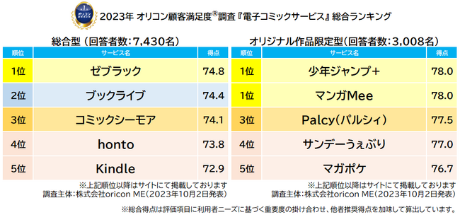 実際のサービス利用者を対象に第三者の立場で顧客満足度調査を実施する株式会社oricon ME(本社:東京都港区 代表取締役社長:小池 恒 略称:オリコン)は、『電子コミックサービス』についての満足度調査を実施し、2023年10月2日(月)14時にその結果を「オリコン顧客満足度(R)」公式サイト内( (リンク ») )にて発表いたしました。ランキングの結果は、下記の通りとなりました。