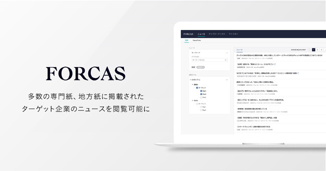 営業DXソリューション「FORCAS」は、1日あたり約2,000件のニュースから、ターゲット企業群に関する必要な情報をキャッチできる機能の提供を、2023年10月3日より開始します。