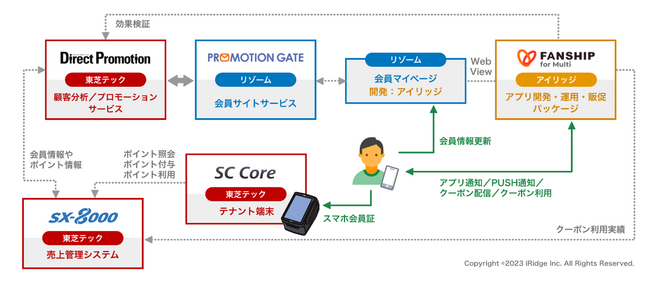 東芝テックの店頭端末およびポイント管理システムとリゾームの会員販促インターフェースとの連携、アイリッジのアプリ開発・運用サービスにより、カードレス運用やポイント情報の照会サービスやクーポン配布などのプロモーション基盤をショッピングセンター向けに提供するものです。