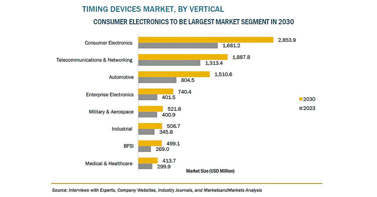 水晶発振器は、2030年までの間、発振器向けタイミングデバイス市場で最大シェアを占める見込みです。水晶発振器は、クロック信号を生成する際に高い精度と安定性を提供し、その特性により、優れた周波数リファレンスとなり、時間の経過に伴う周波数ドリフトを最小限に抑えます。また、一般的に低レベルのジッターと位相ノイズを示すため、データインテグリティとシステム性能のためにクリーンなクロック信号を必要とするアプリケーションに適しています。水晶発振器は、家庭用電化製品、電気通信、産業用オートメーション、自動車システム、航空宇宙など、幅広いアプリケーションで使用されており、さまざまな集積回路(IC)や部品と互換性があるため、幅広い電子機器での使用が可能です。