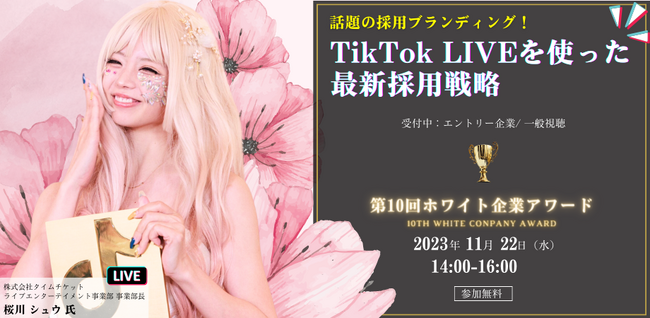 第10回ホワイト企業アワード内にて、TikTok LIVEトップクリエイターの桜川シュウ氏をスペシャルゲストに迎え、Z世代を惹きつけるSNSの採用戦略についてご講演いただきます!