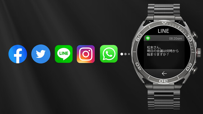 通知機能:LINE、Twitter、Facebook、Instagramなどのメッセージの受信が可能で、ウォッチで着信に応答したり、拒否したりなどもができ、便利性があります。