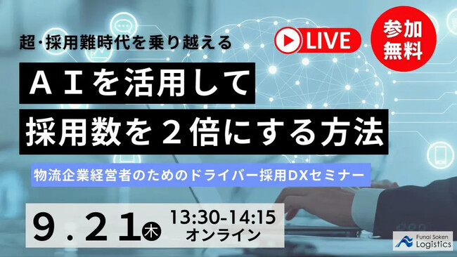 国内最大級のロジスティクス・物流コンサルティングファーム船井総研ロジ株式会社(東京本社:東京都千代田区、代表:菅重宏、以下「船井総研ロジ」)は、2023年9月21日(木)物流企業経営者を対象に「超・採用難時代を乗り越える AIを活用して採用数を2倍にする方法 AIを活用したドライバー採用DXセミナー」をオンラインで開催しました。